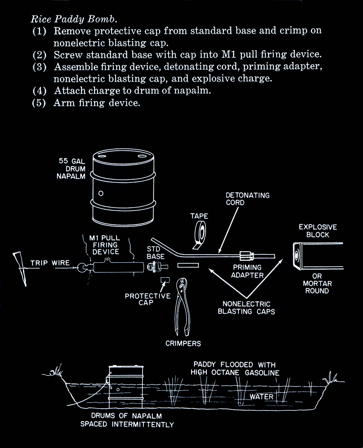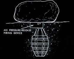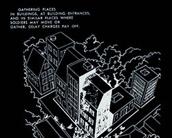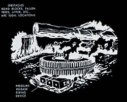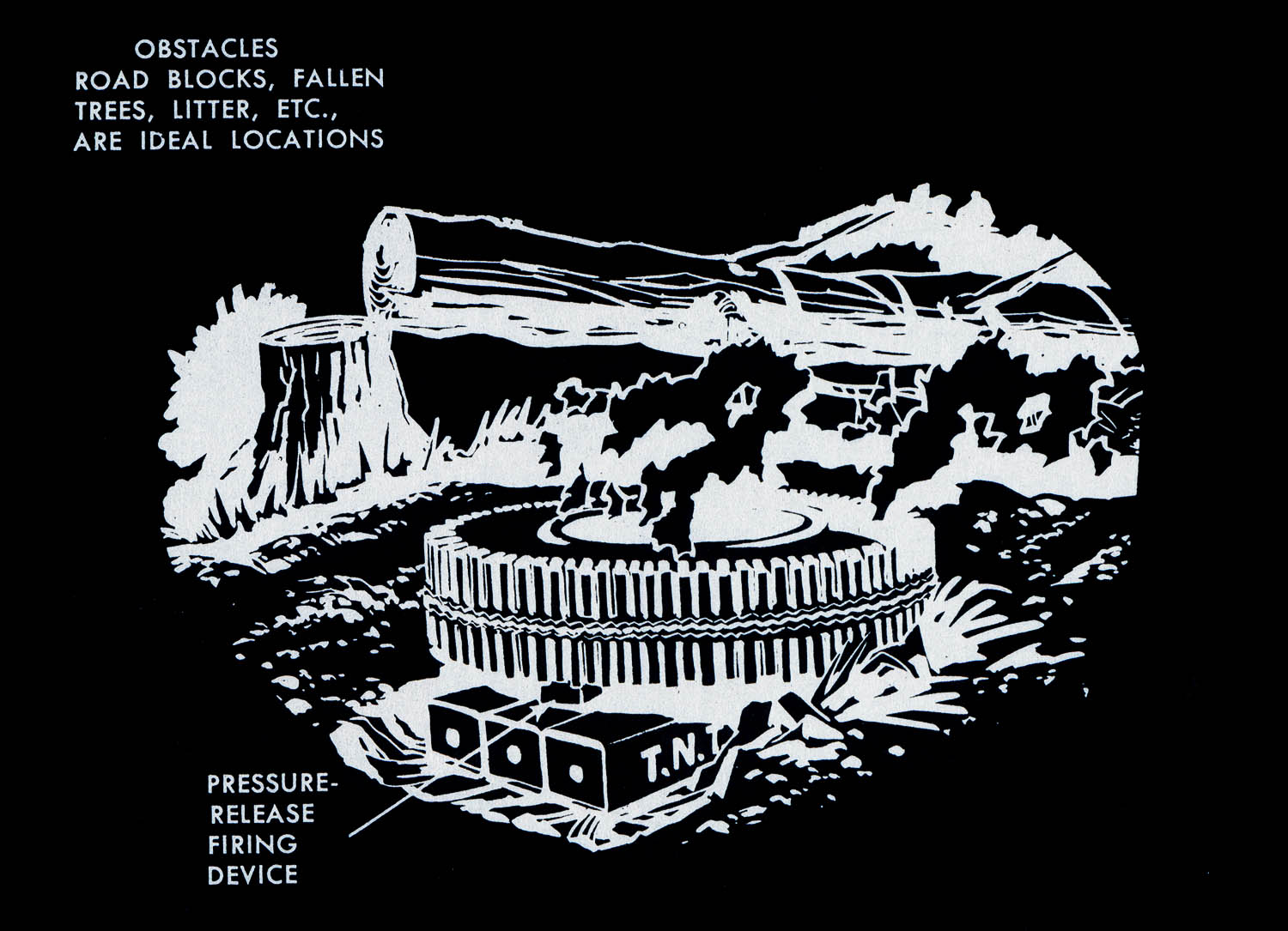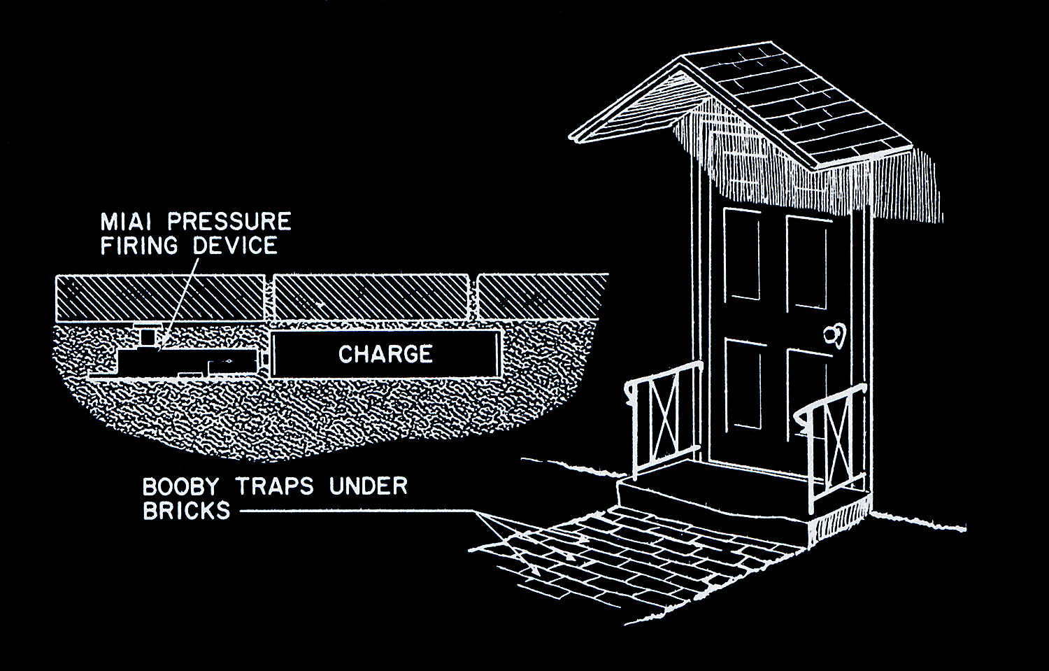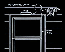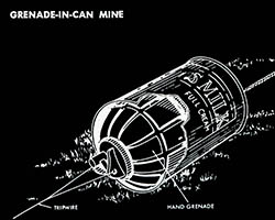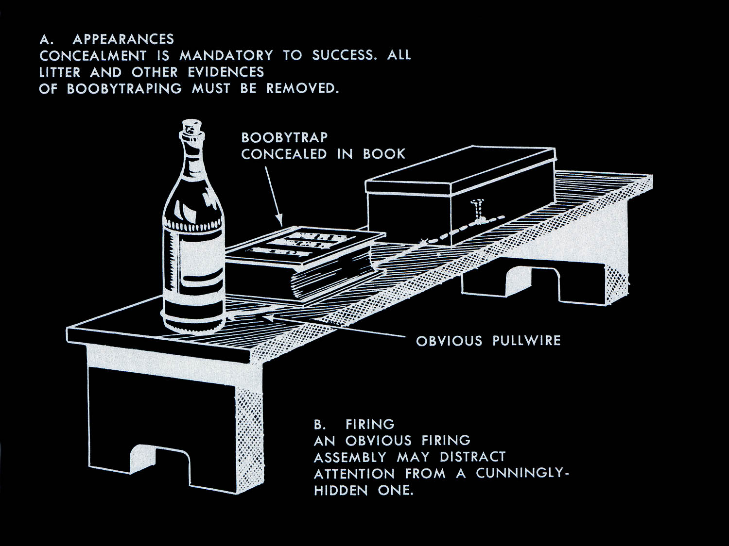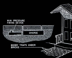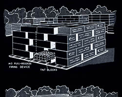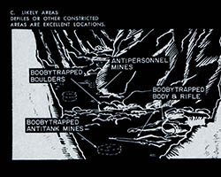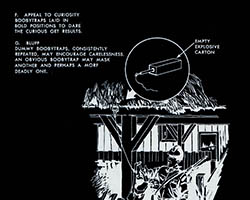 The images of this series are based on illustrations from two books “Boobytraps” (1965) and “Unconventional Warfare Devices and Techniques - References” (1966). These two so-called “Army Field Manuals” by the US-Army are handbooks that help teaching soldiers the skills of warfare, they instruct them how to use and construct boobytraps.