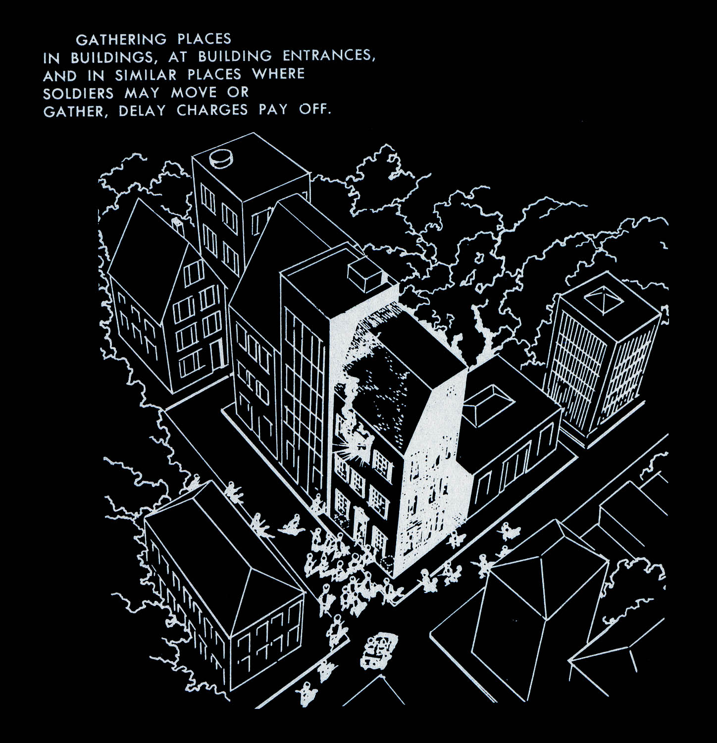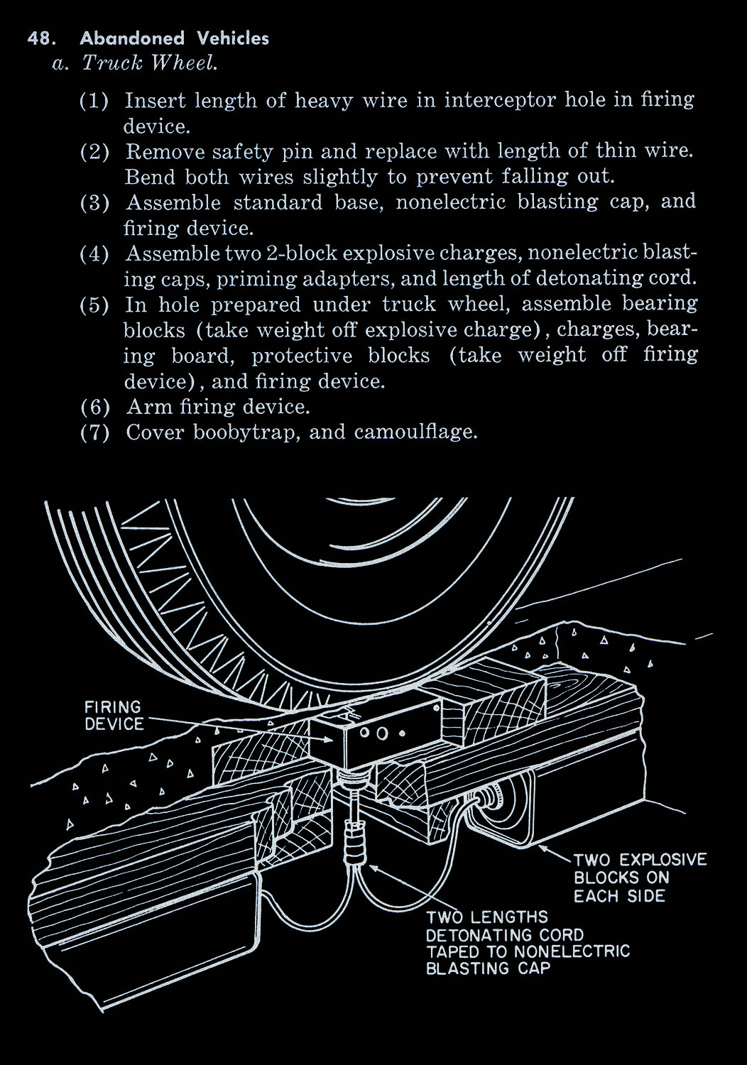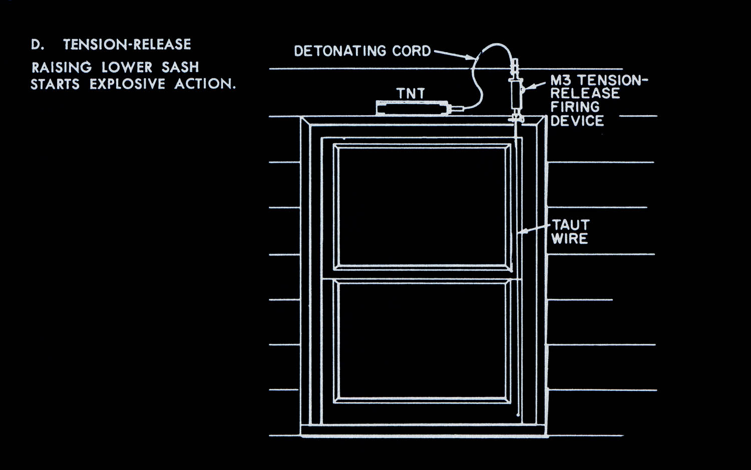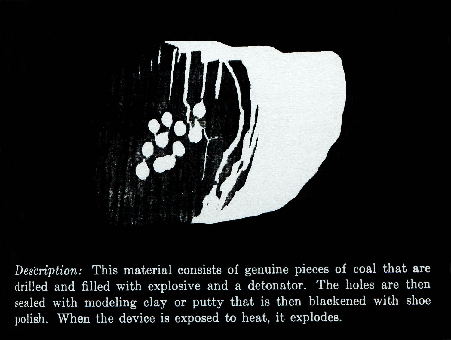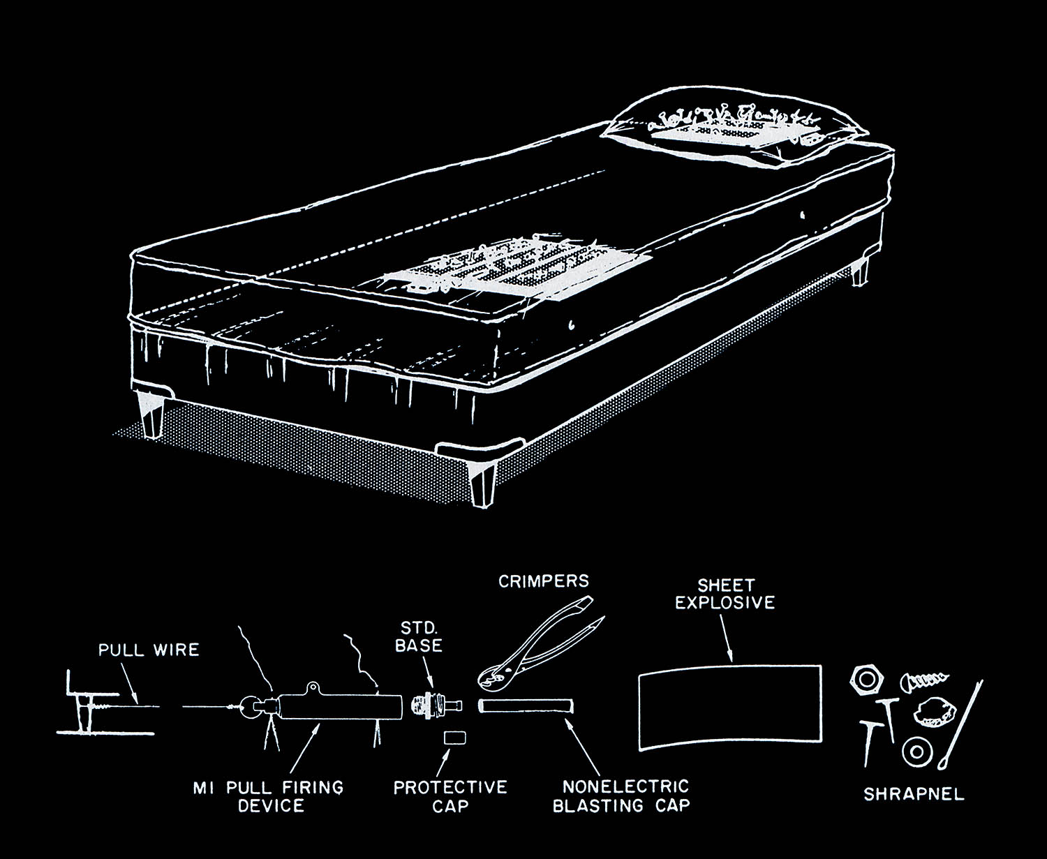 The images of this series are based on illustrations from two books “Boobytraps” (1965) and “Unconventional Warfare Devices and Techniques - References” (1966). These two so-called “Army Field Manuals” by the US-Army are handbooks that help teaching soldiers the skills of warfare, they instruct them how to use and construct boobytraps.