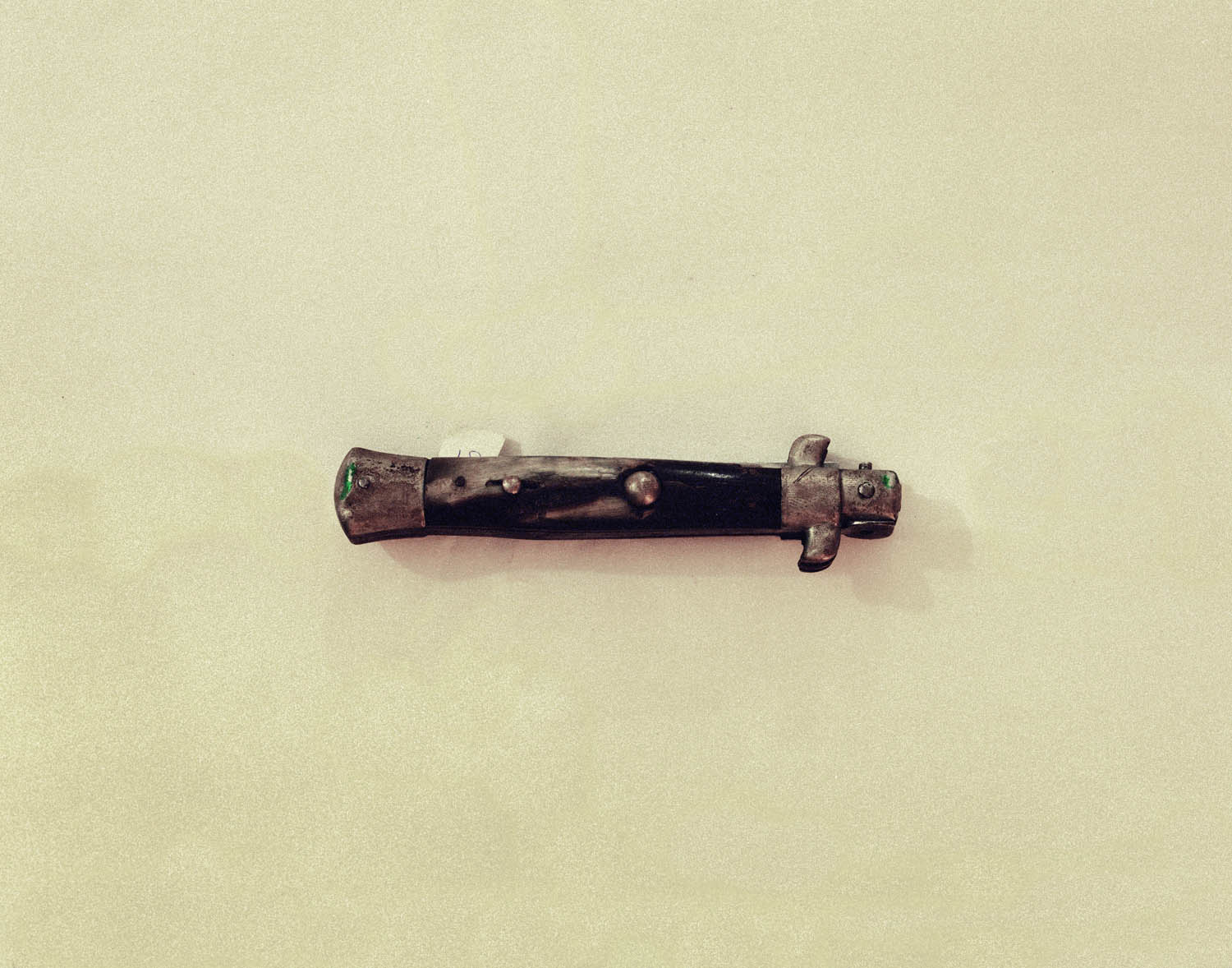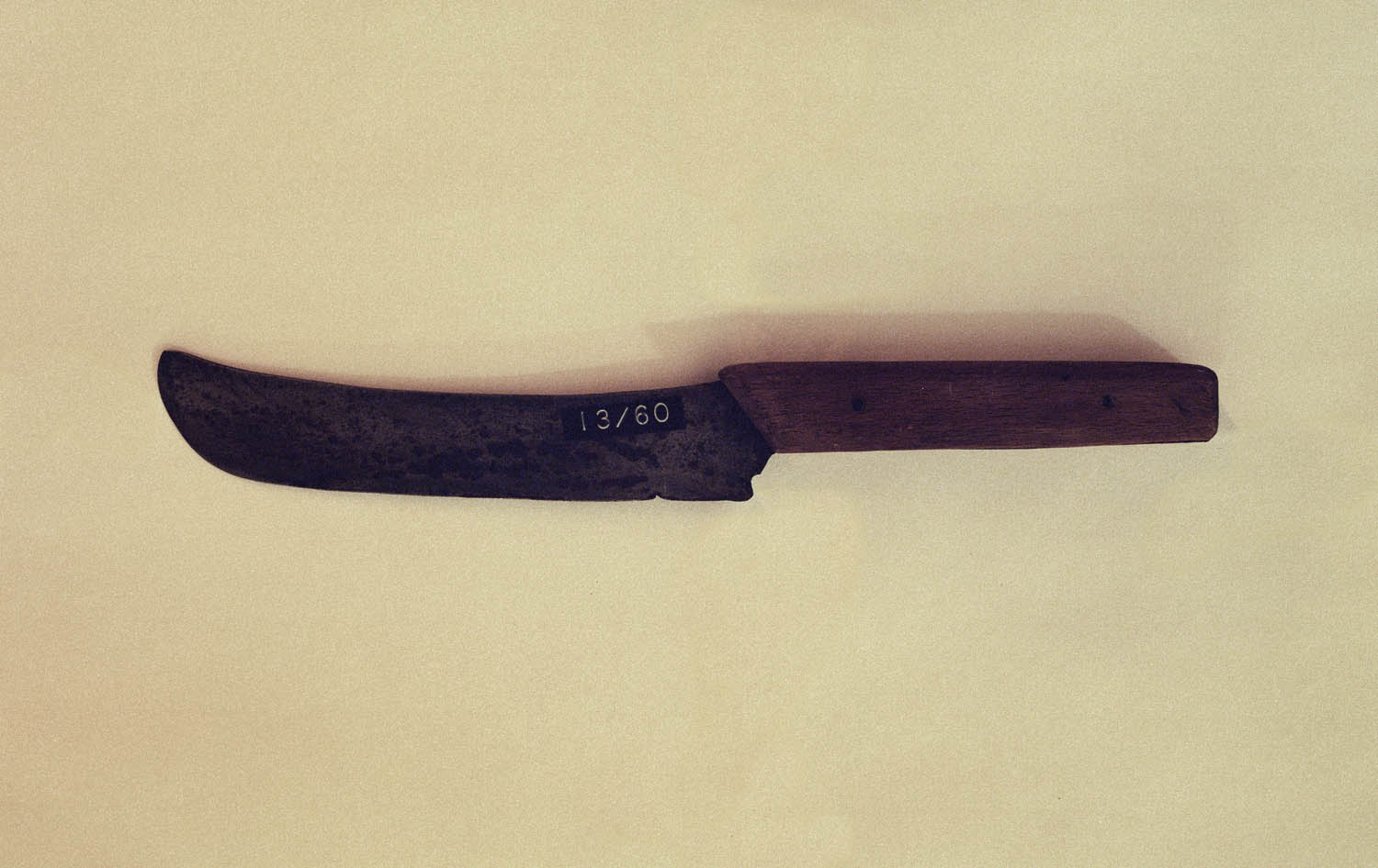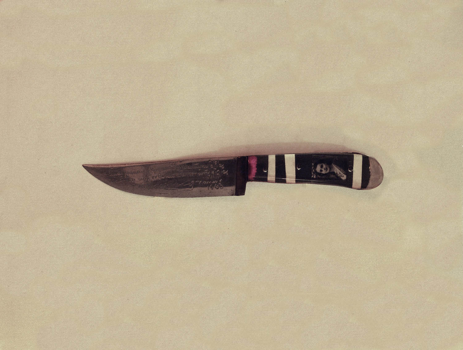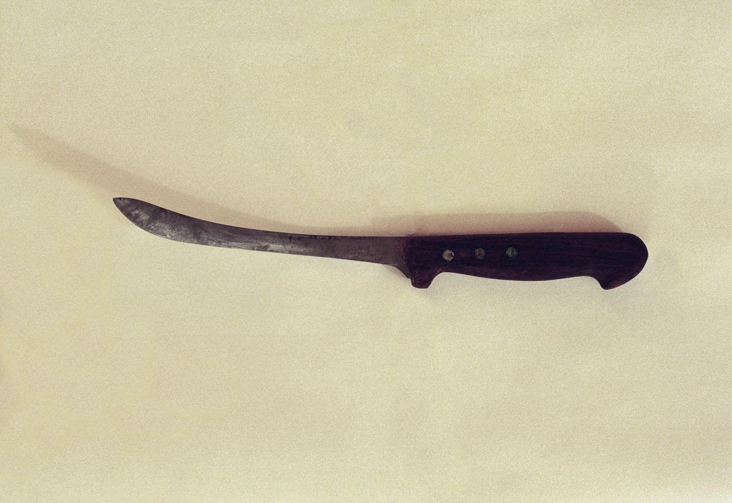 The images of this project all show weapons that have been used to murder people. It is interesting how much these images change as soon as the viewer recognizes that there is a story underneath the surface of the image. Without knowing this, these images show nothing more than knifes and guns.