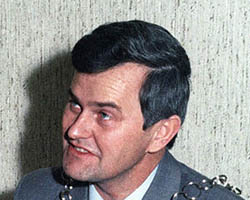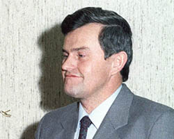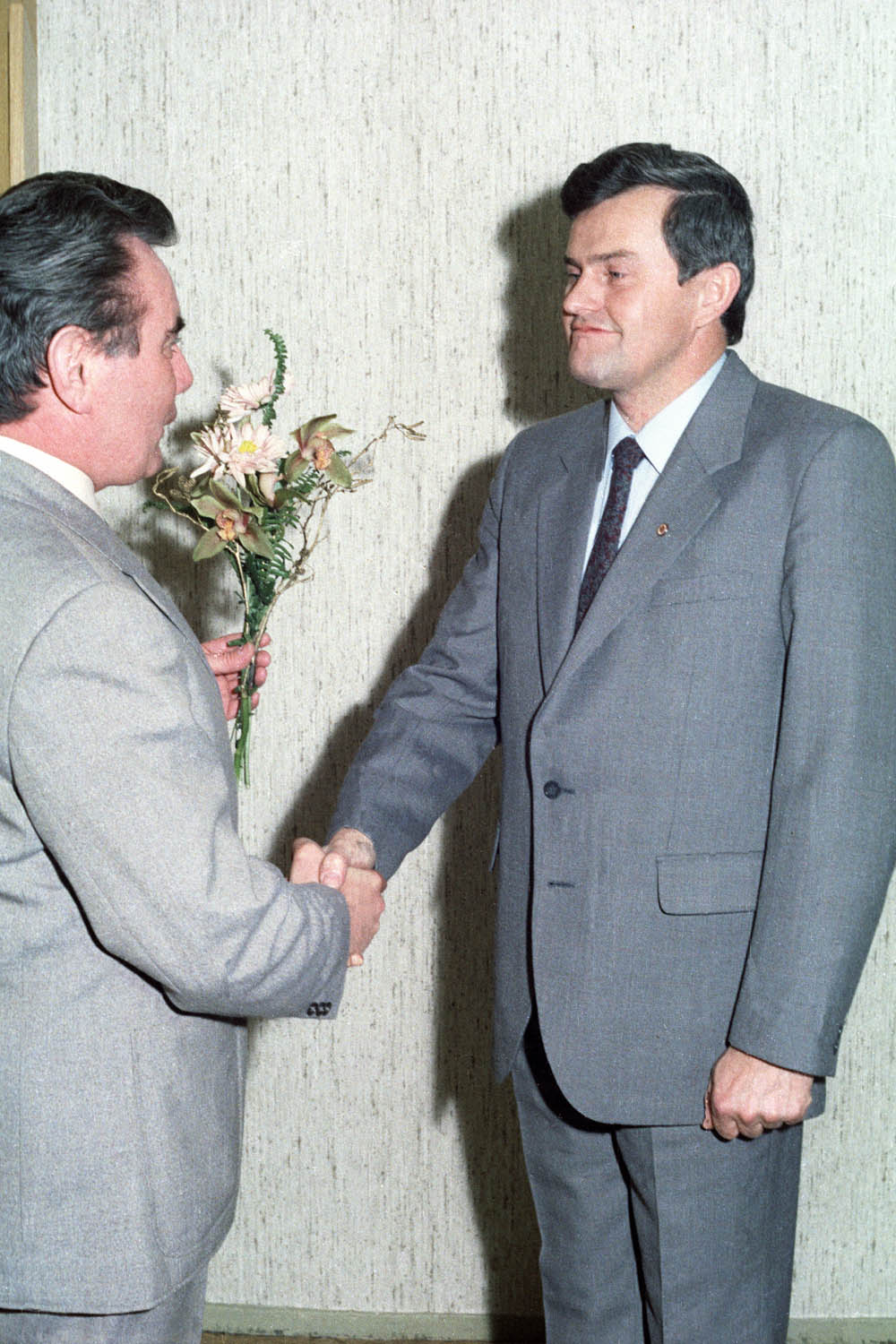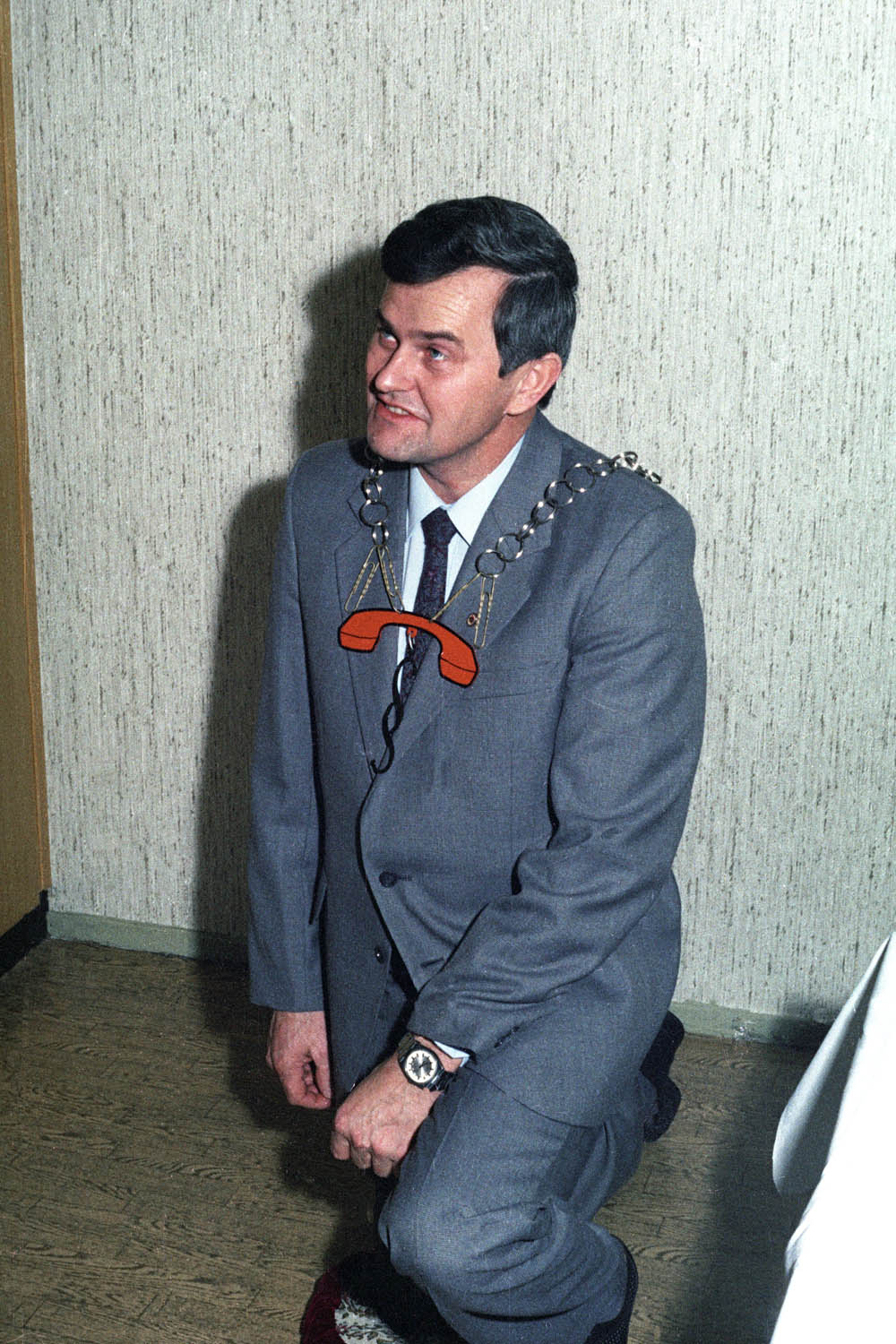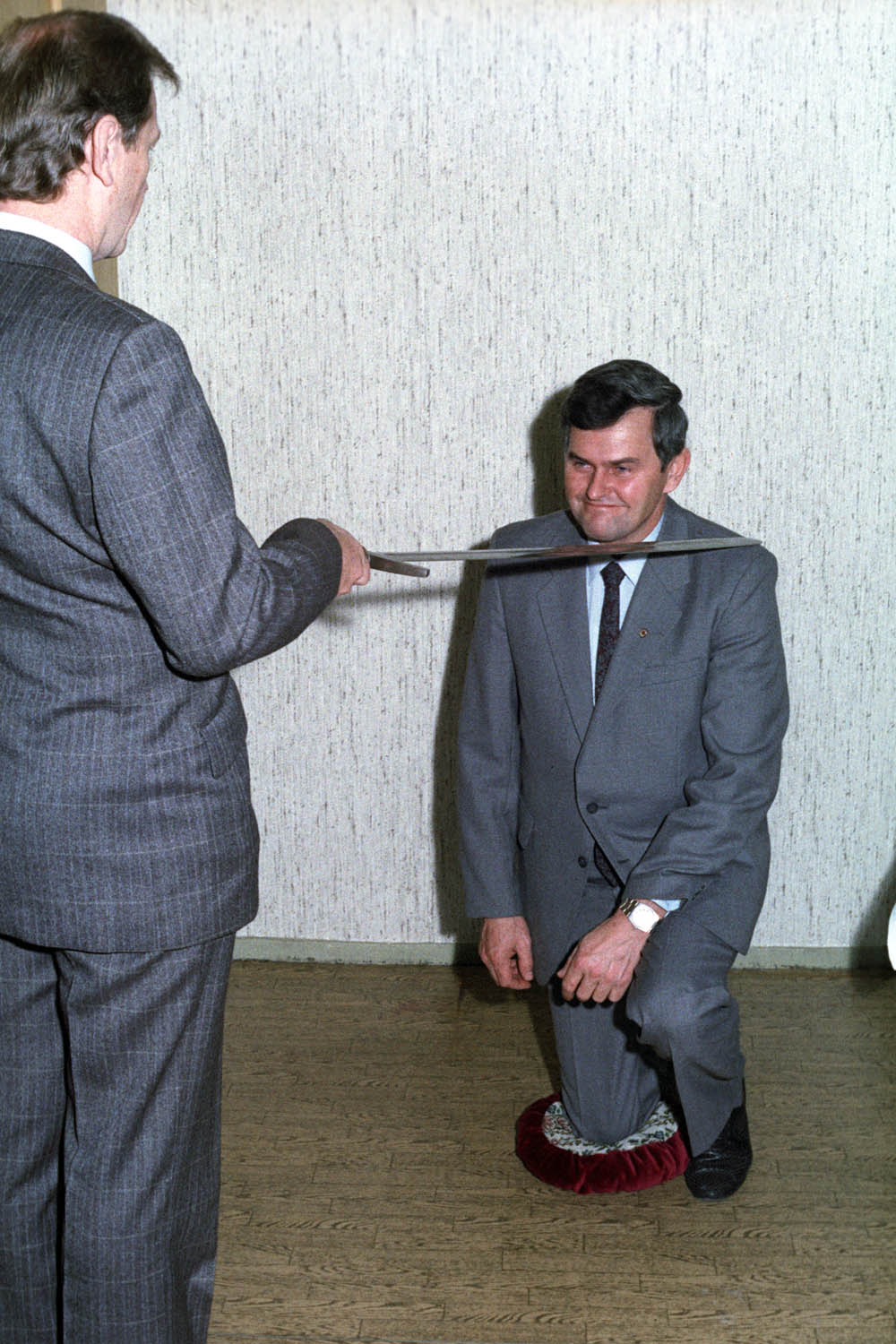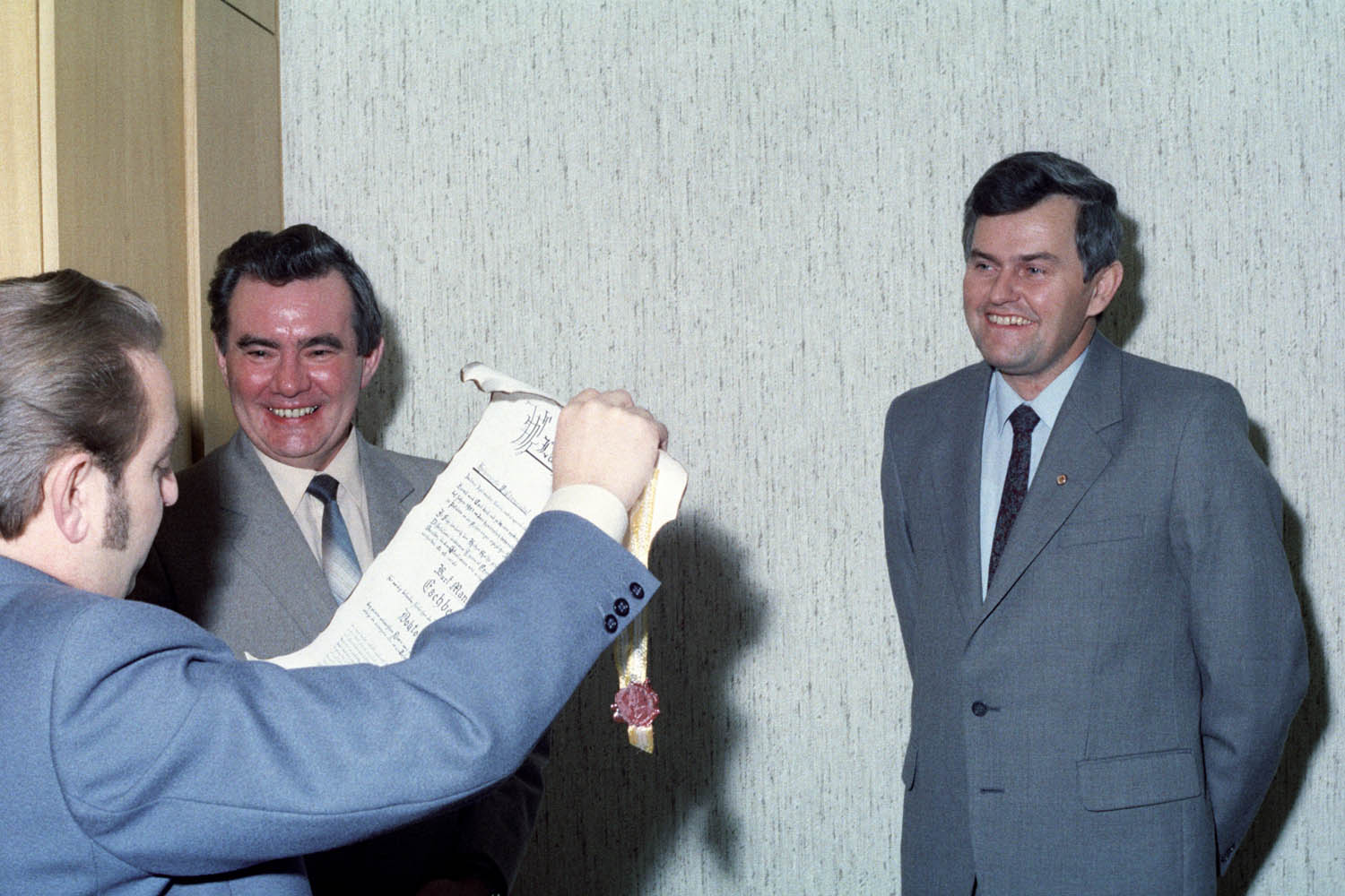Not a completely standard awards ceremony. Unfortunately, the text on the certificate that is being handed over is illegible.