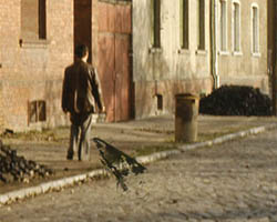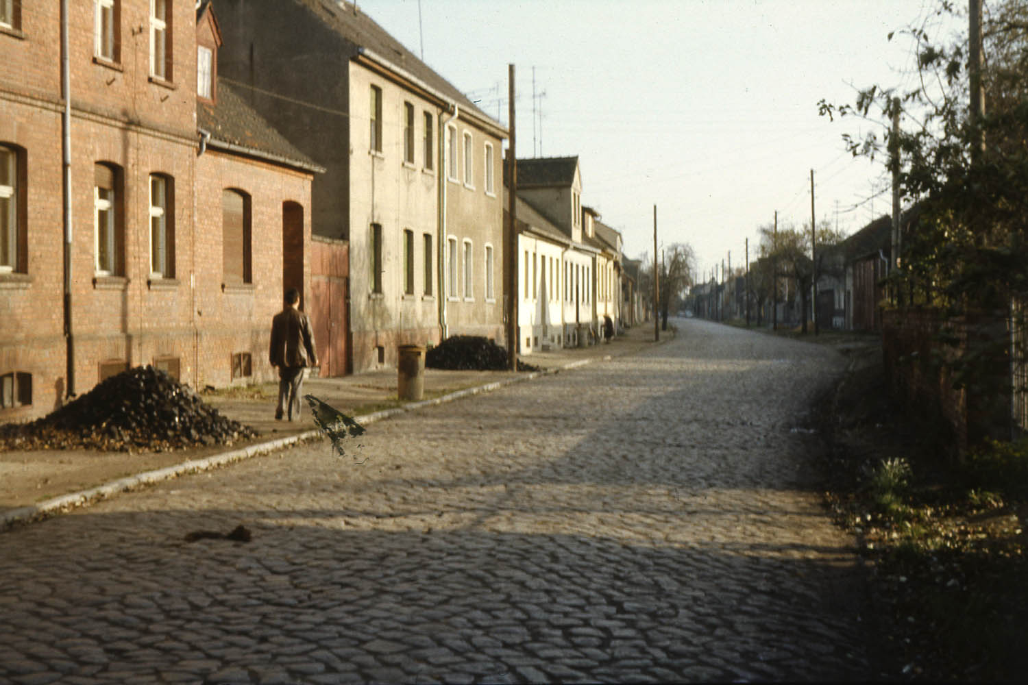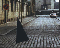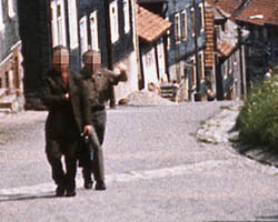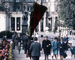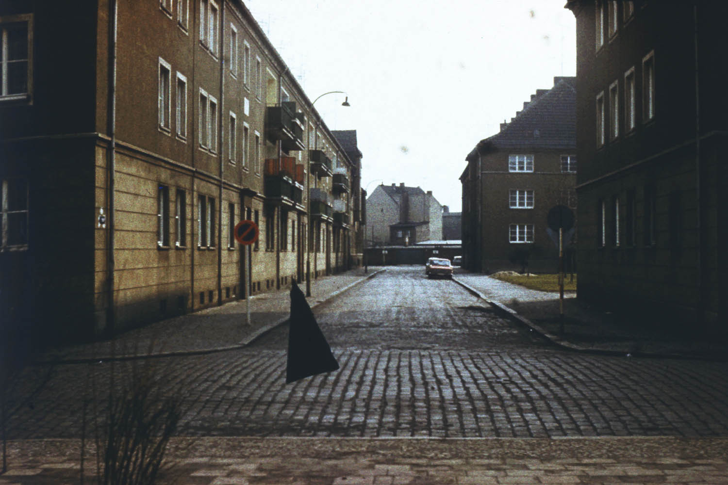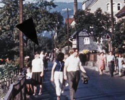 These images are taken from a film documenting the shadowing of an individual person. The subject is indicated with an arrow on some of the pictures. These arrows (three to four millimeters in size) are made out of plastic snippets that were skillfully pasted directly onto the slide. However, it is impossible to state with absolute certainty whether the arrows are actually pointing at the person being shadowed.
