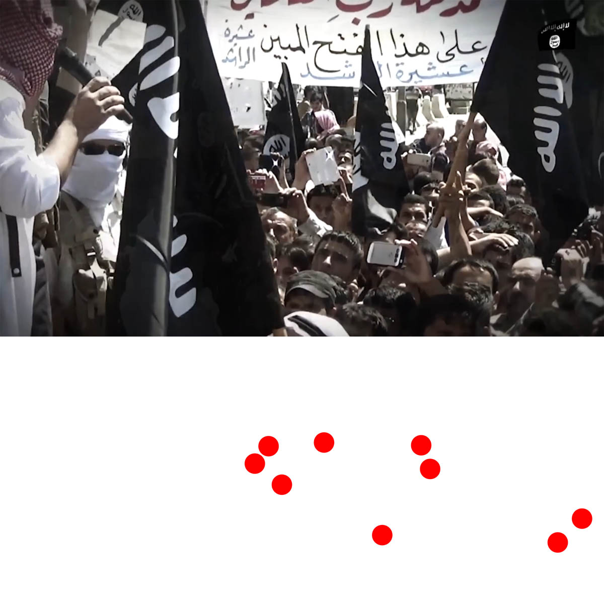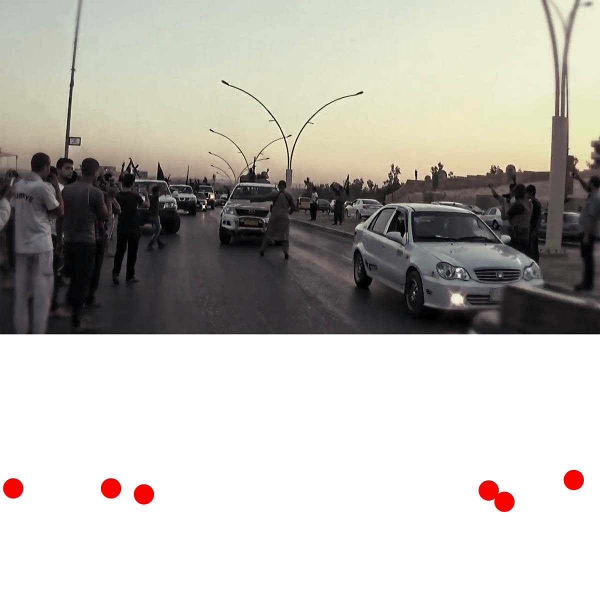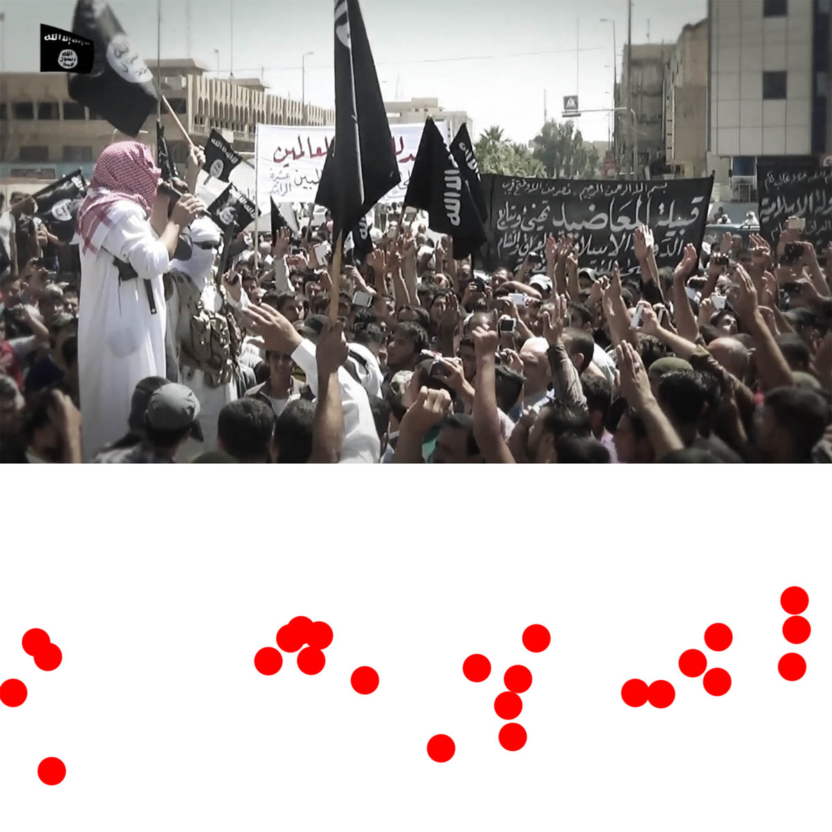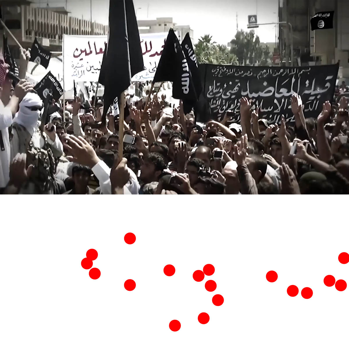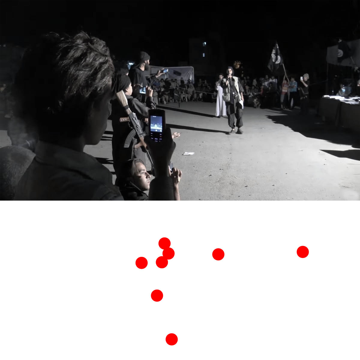 Aniconism – or the prohibition by some interpretations of Islam against the depiction of sentient beings – used to be a key point in the doctrine of some of the most radical Islamist groups. Apparently that is long gone. In this ongoing project I am collecting stills from Islamist propaganda videos depicting large crowds. The red dots indicate the persons filming the scenes with their phones.