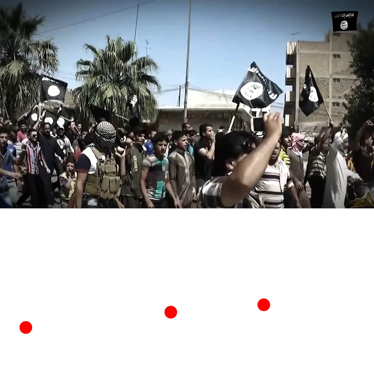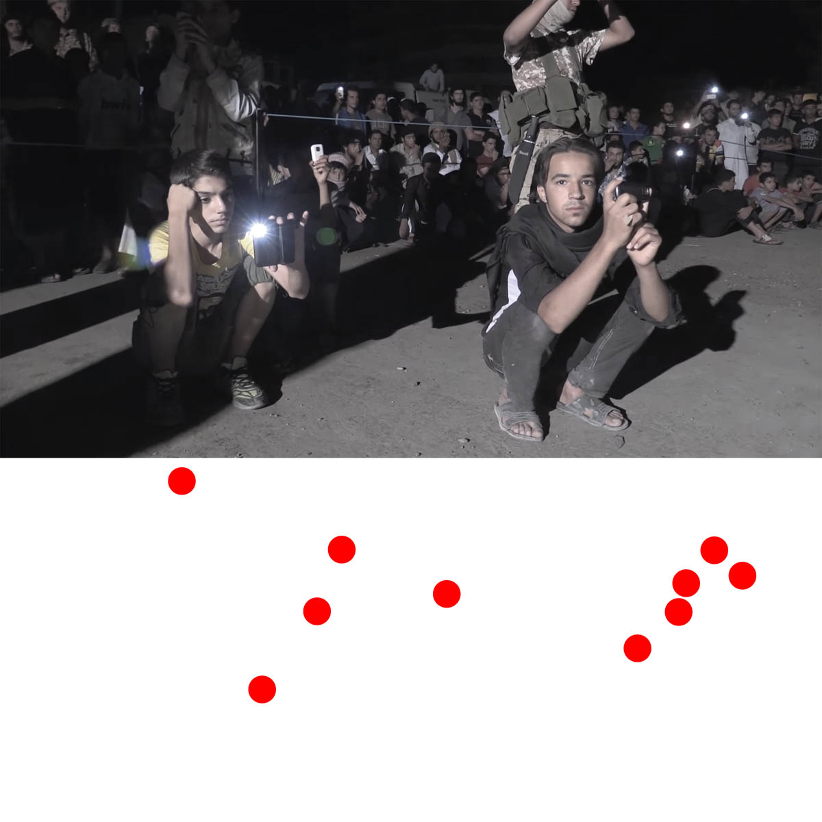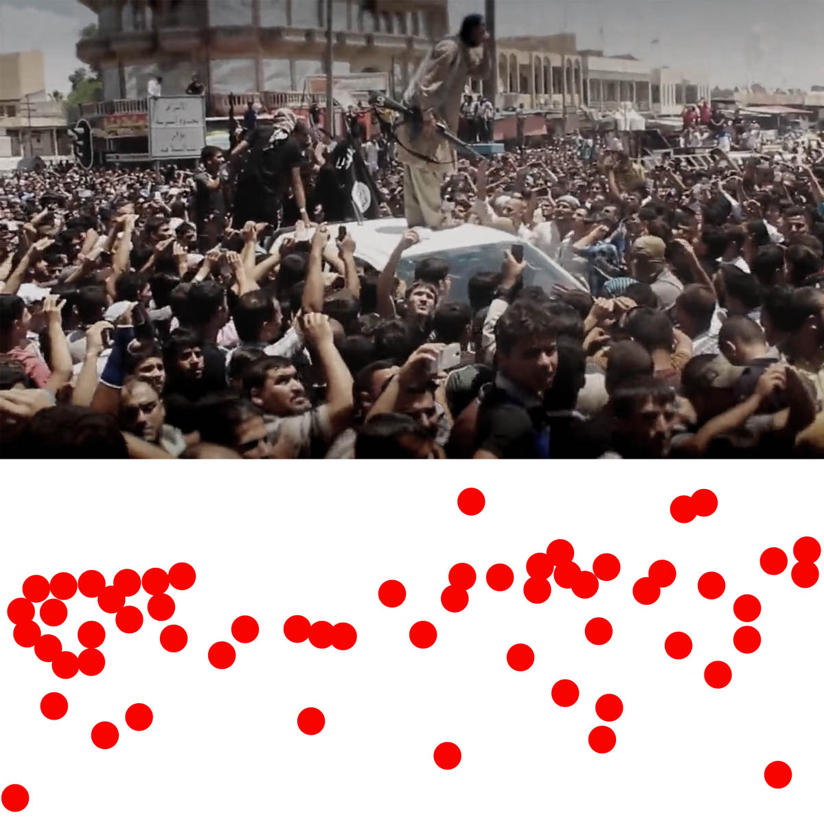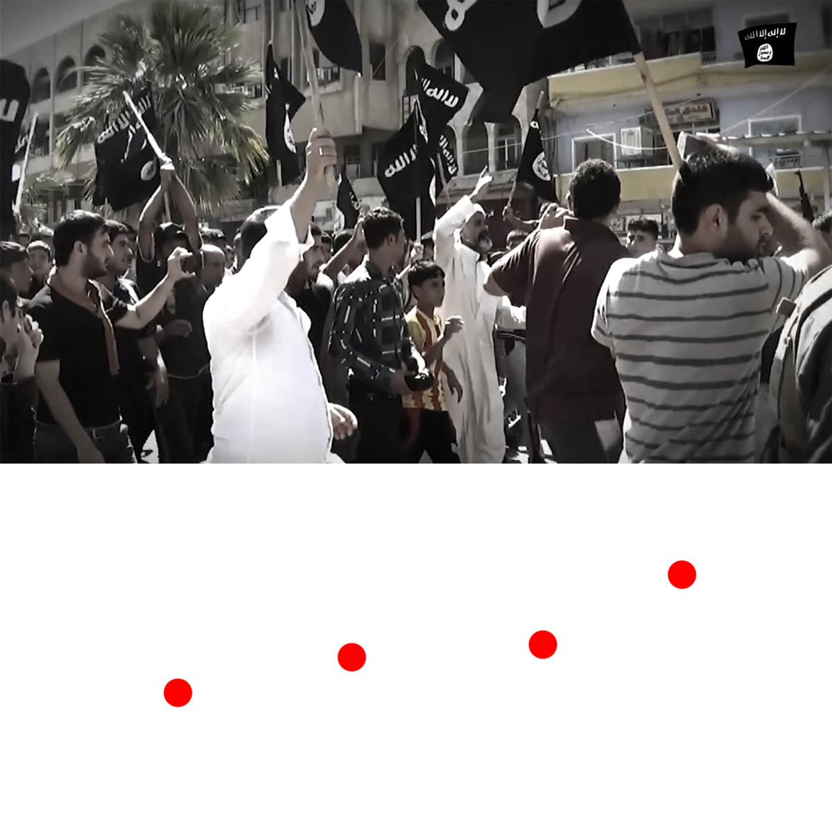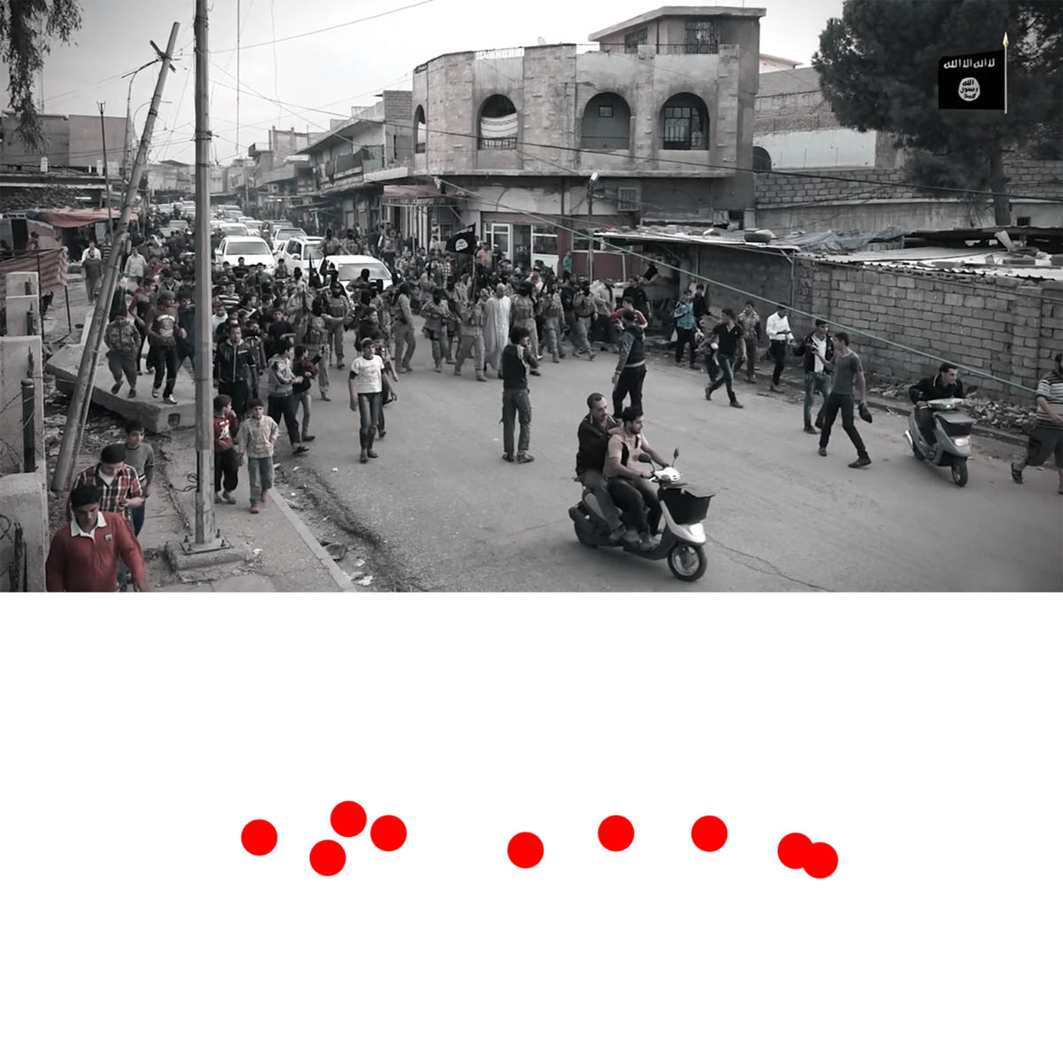 Aniconism – or the prohibition by some interpretations of Islam against the depiction of sentient beings – used to be a key point in the doctrine of some of the most radical Islamist groups. Apparently that is long gone. In this ongoing project I am collecting stills from Islamist propaganda videos depicting large crowds. The red dots indicate the persons filming the scenes with their phones.