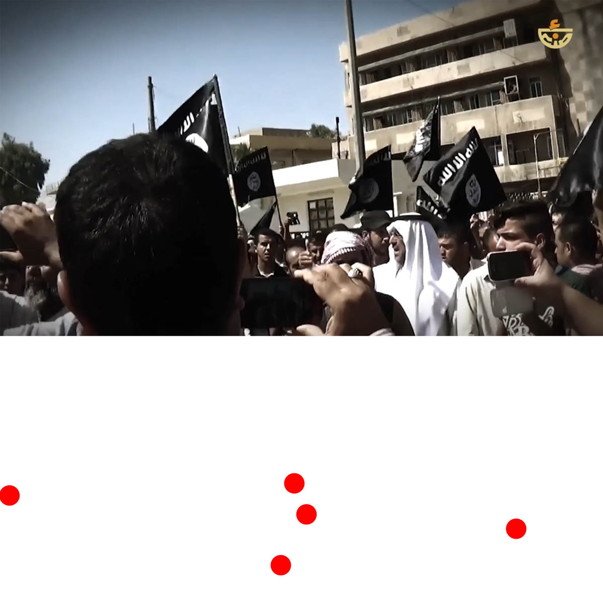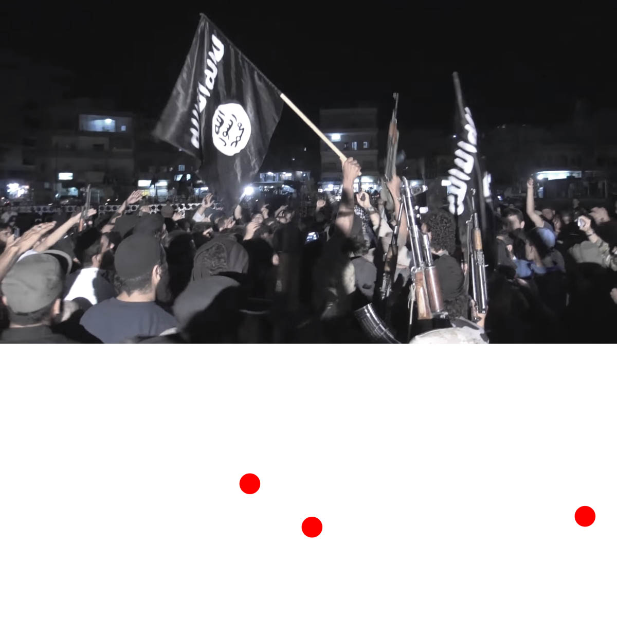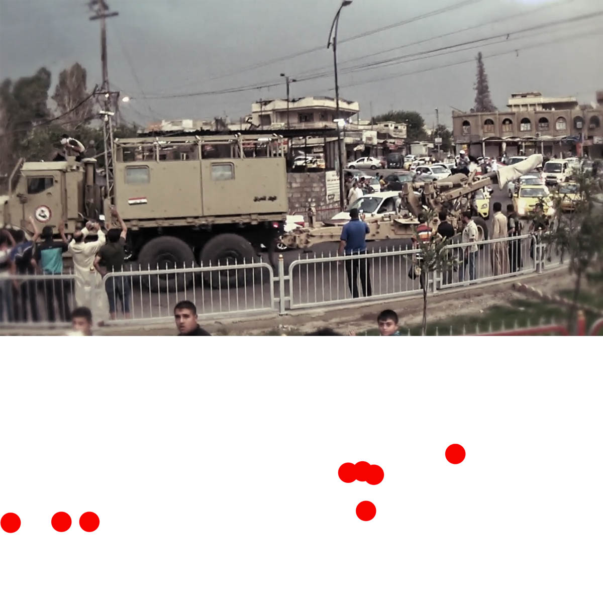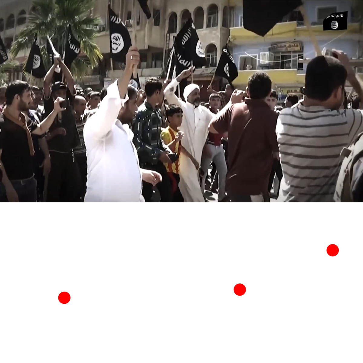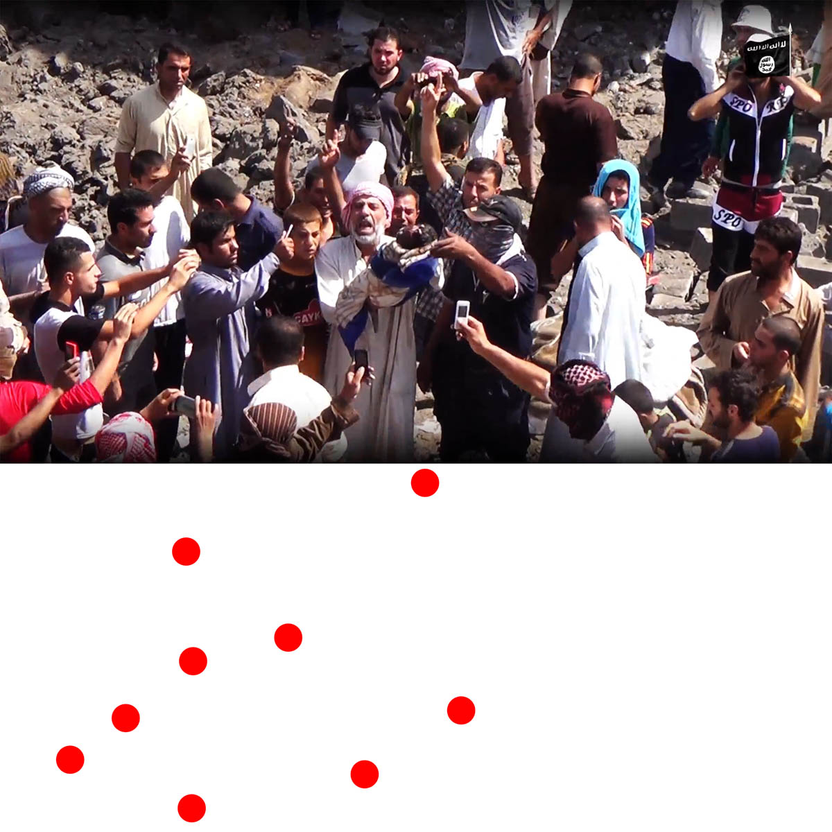 Aniconism – or the prohibition by some interpretations of Islam against the depiction of sentient beings – used to be a key point in the doctrine of some of the most radical Islamist groups. Apparently that is long gone. In this ongoing project I am collecting stills from Islamist propaganda videos depicting large crowds. The red dots indicate the persons filming the scenes with their phones.