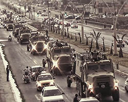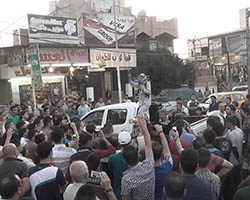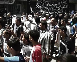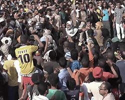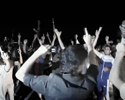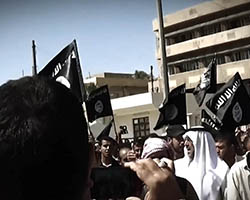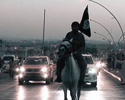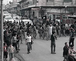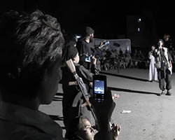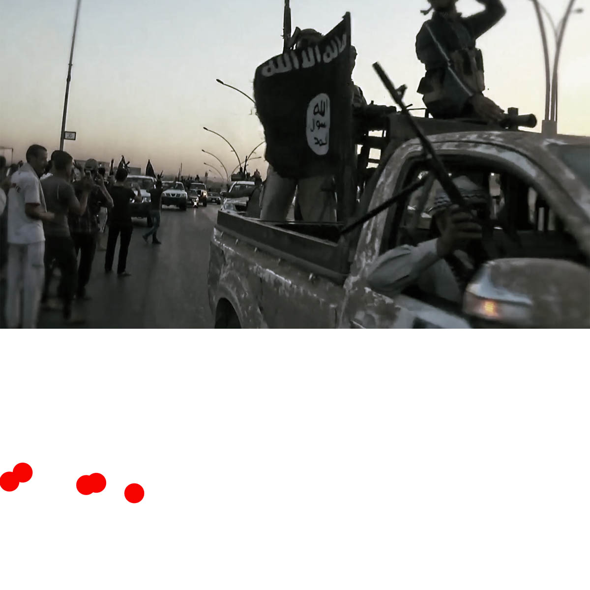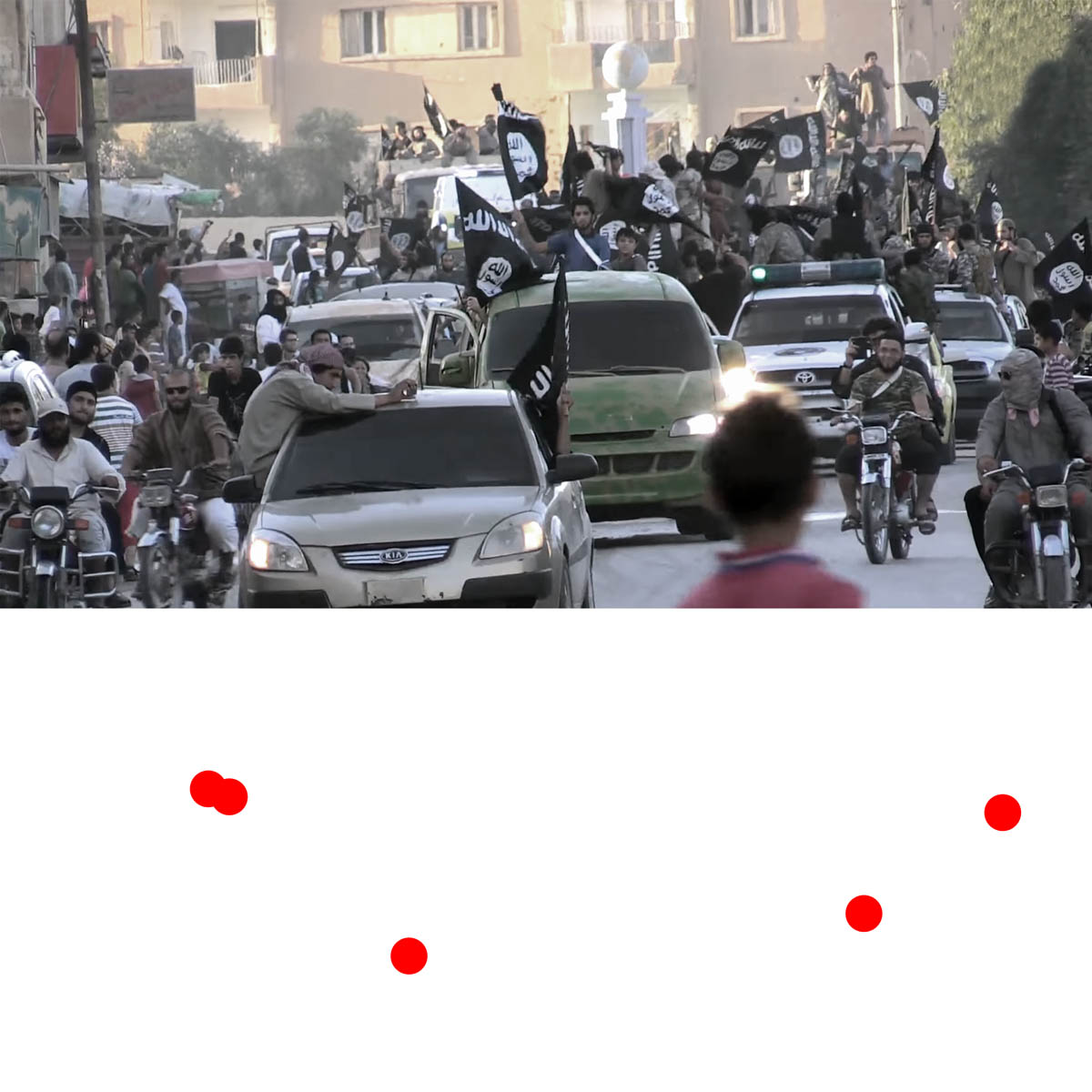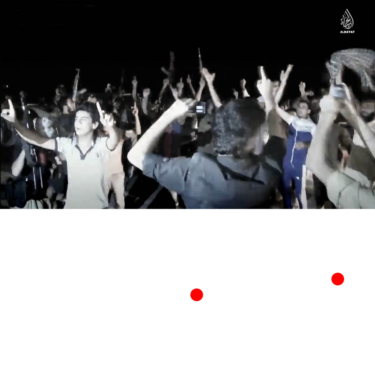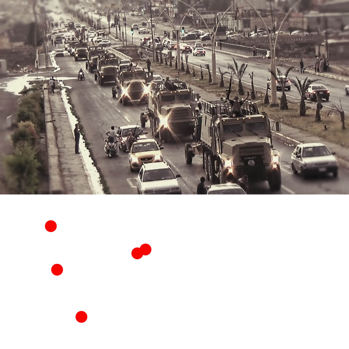 Aniconism – or the prohibition by some interpretations of Islam against the depiction of sentient beings – used to be a key point in the doctrine of some of the most radical Islamist groups. Apparently that is long gone. In this ongoing project I am collecting stills from Islamist propaganda videos depicting large crowds. The red dots indicate the persons filming the scenes with their phones.